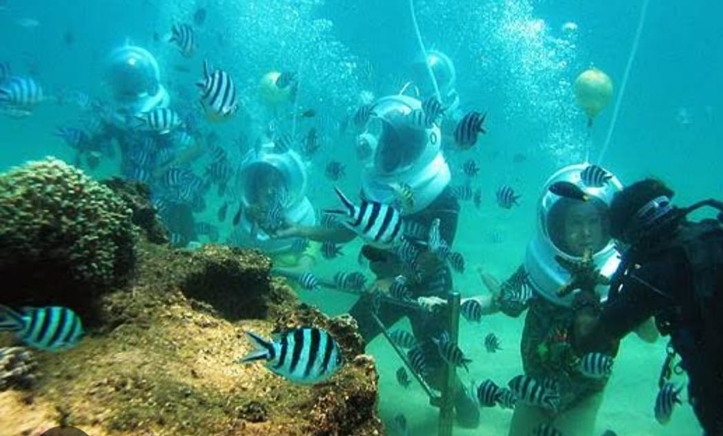 Cool off from the tropical island heat by walking at the bottom of the ocean and see what goes on down there.